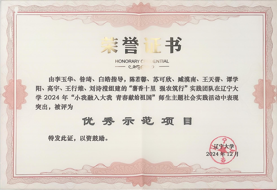 必赢官网8873欢迎您“薯香十里 强农筑行”实践团队在必赢官网8873欢迎您2024年“小我融入大我 青春献给祖国”师生主题社会实践活动优秀示范项目。